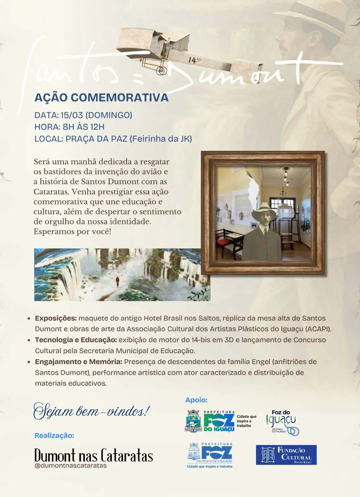 A programação inclui ainda a presença de um ator caracterizado como Santos Dumont, a participação de descendentes da família Engel — que recebeu o inventor durante sua visita a Foz do Iguaçu — e a entrega de gibis com uma história infantil sobre a relação do inventor com as Cataratas, com apoio da Revista 100Fronteiras.