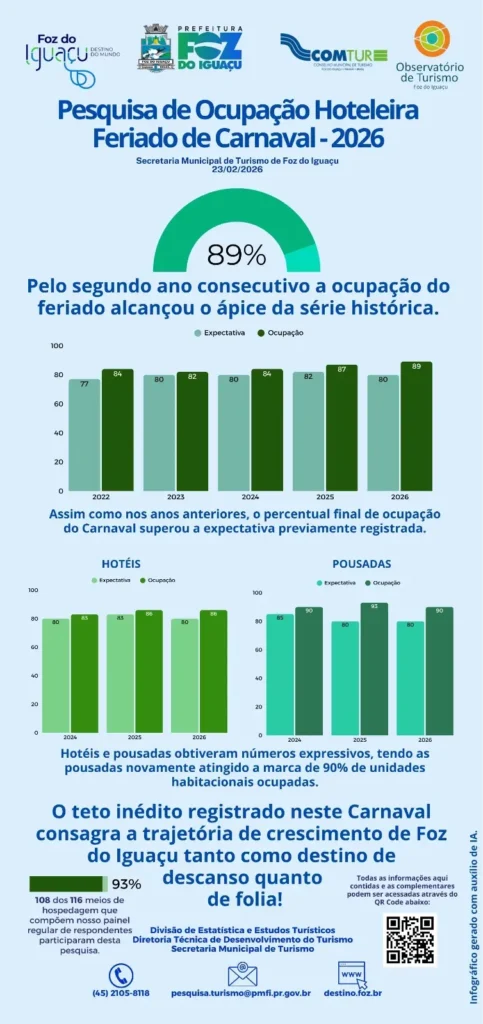A Secretaria Municipal de Turismo de Foz do Iguaçu (SMTU) divulga, nesta segunda-feira (23), o resultado da Pesquisa de Ocupação do feriado de Carnaval 2026, realizada pela Divisão de Estatística e Estudos Turísticos (DVEET). A média foi de 89%, o maior índice já registrado, superando os resultados de 2022 (84%), 2023 (82,25%), 2024 (84%) e 2025 (86,86%).