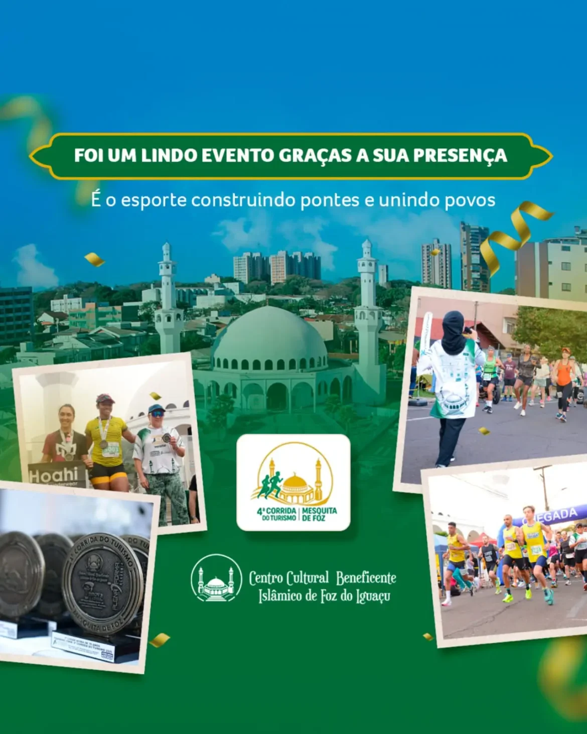 A afirmação “Esporte constrói pontes e une povos” é verdadeira. A 4ª Corrida do Turismo da região trinacional teve como ponto central a Mesquita Omar Ibn Al-Khattab e reuniu culturas diversas e participantes de diferentes cidades e países. A colombiana Nura Laura Paipa ressaltou o encontro de diferentes nacionalidades. “É muito bonita a união que o esporte proporciona. Todos juntos correndo com um mesmo objetivo”.