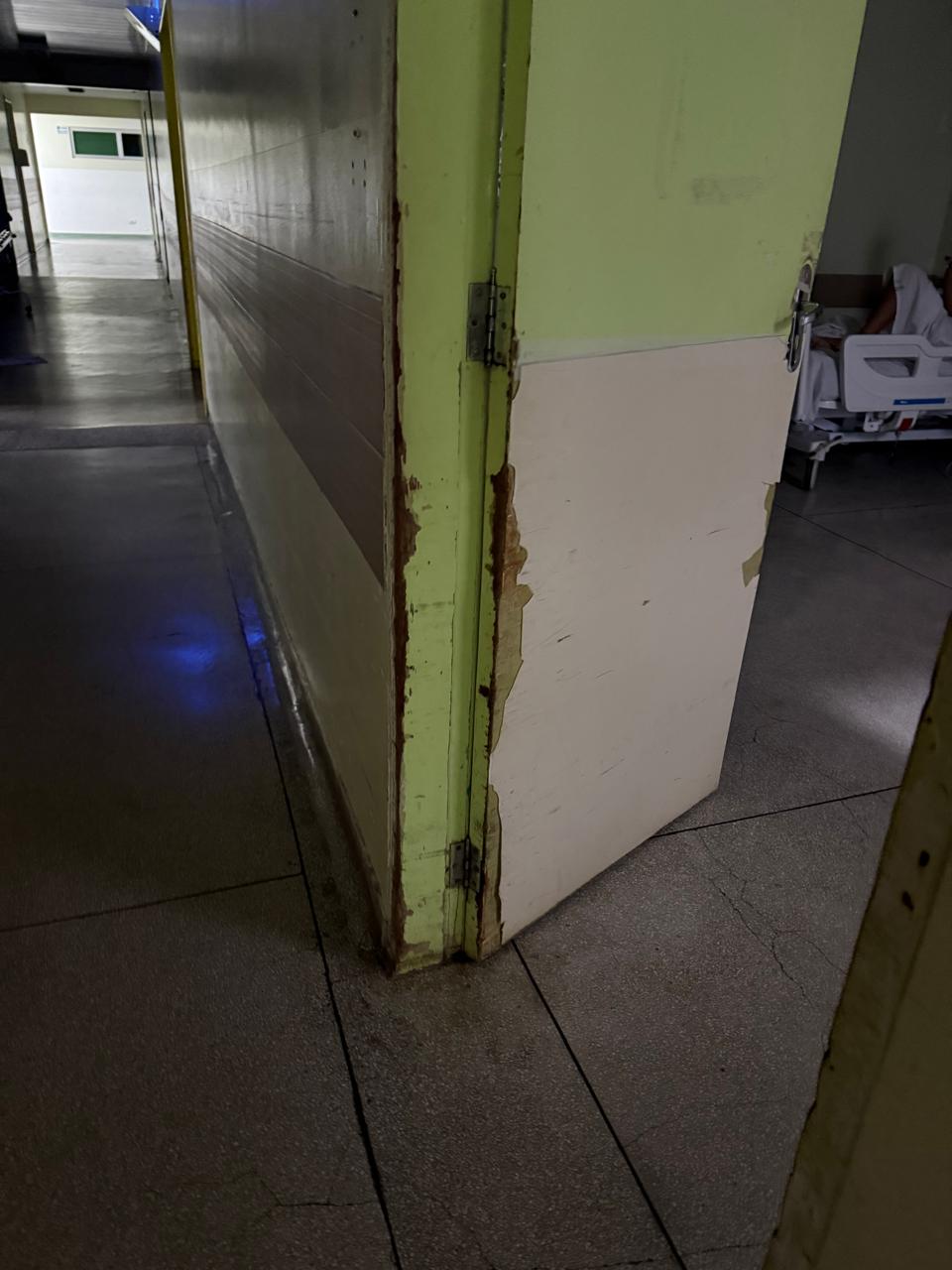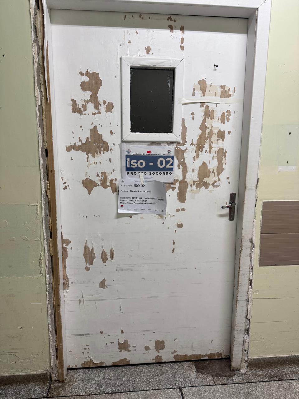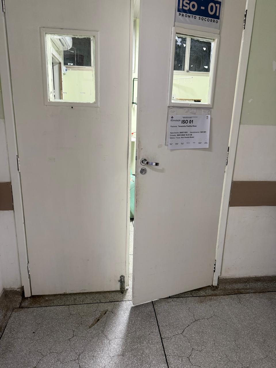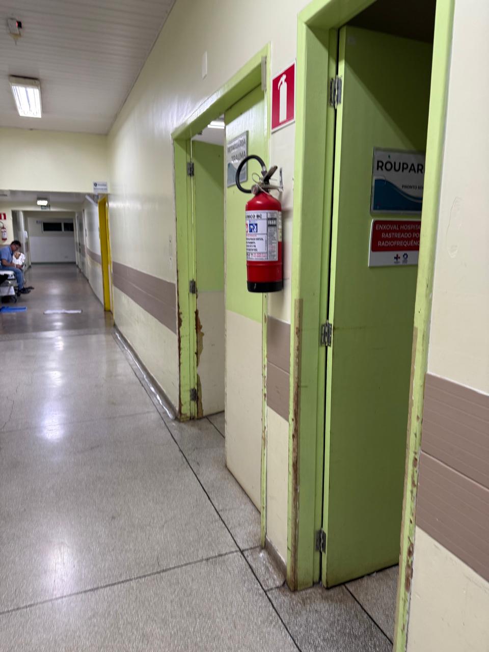 As imagens mostram portas com dificuldades de fechamento, desgastes visíveis e improvisações, além de lixo acumulado em locais de passagem, cenário incompatível com um ambiente hospitalar que deveria prezar pela segurança, higiene e acolhimento dos pacientes.