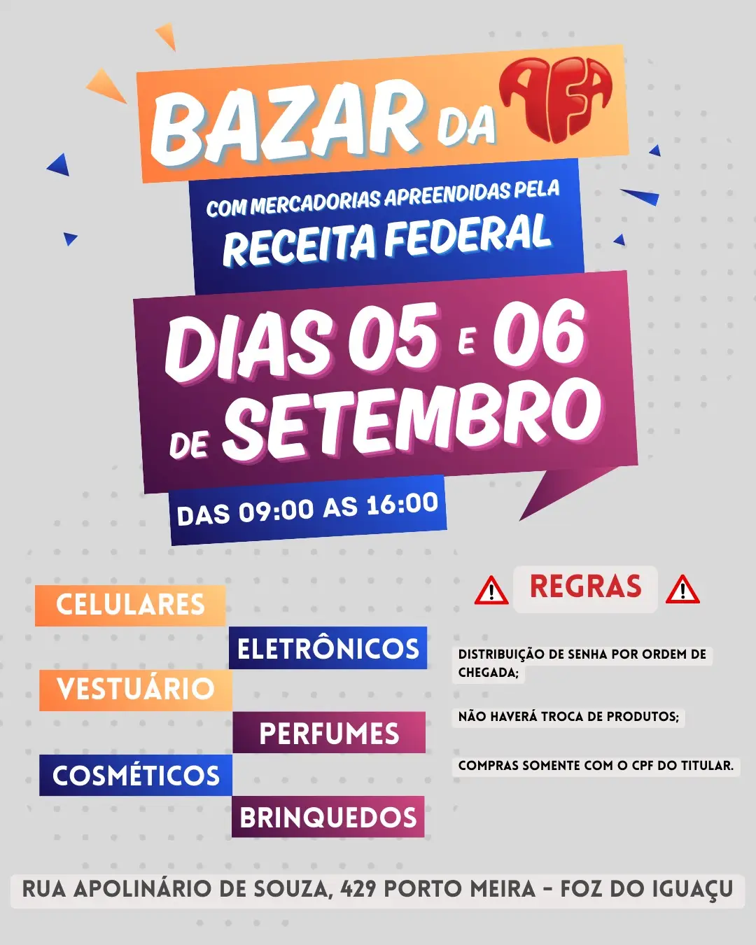 Nos dias 5 e 6 de setembro (sexta e sábado da semana que vem) vai ter Bazar da Associação Fraternidade Aliança.