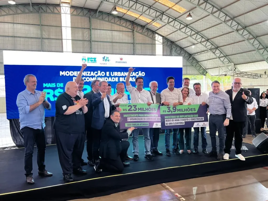Nesta quinta-feira (13), o governador Carlos Massa Ratinho Junior assinou a ordem de serviço que autoriza o início das obras de reurbanização e implantação da rede de água e esgoto na comunidade do Bubas, localizada no bairro Porto Meira, região Sul de Foz do Iguaçu. A solenidade aconteceu na quadra do Centro Escola Bairro Francisco Bubas.