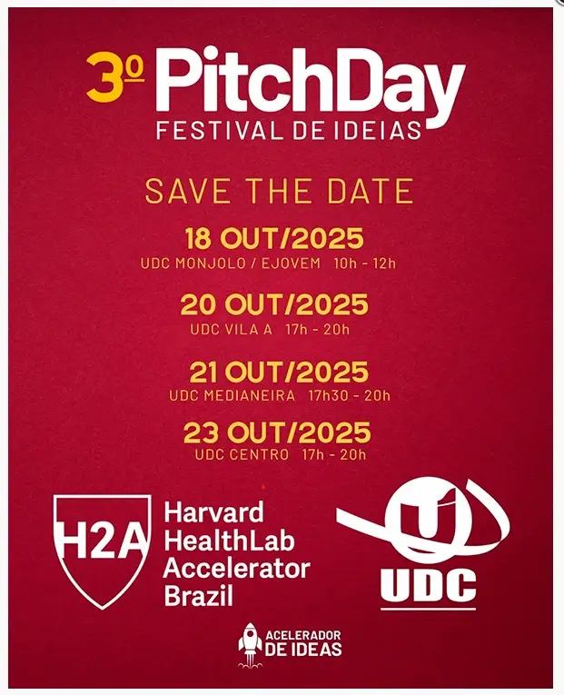 Iniciou-se oficialmente a 3ª edição do PitchDay, o festival anual de ideias promovido pelo Grupo UDC em parceria com o renomado Programa Harvard HealthLab Accelerator (H2A). O evento, que conecta estudantes brasileiros à professores, pesquisadores e equipe da Universidade de Harvard, segue até o dia 24 de outubro, movimentando os dois Centros Universitários UDC, em Foz do Iguaçu e Medianeira, além dos 6 colégios do Grupo.
